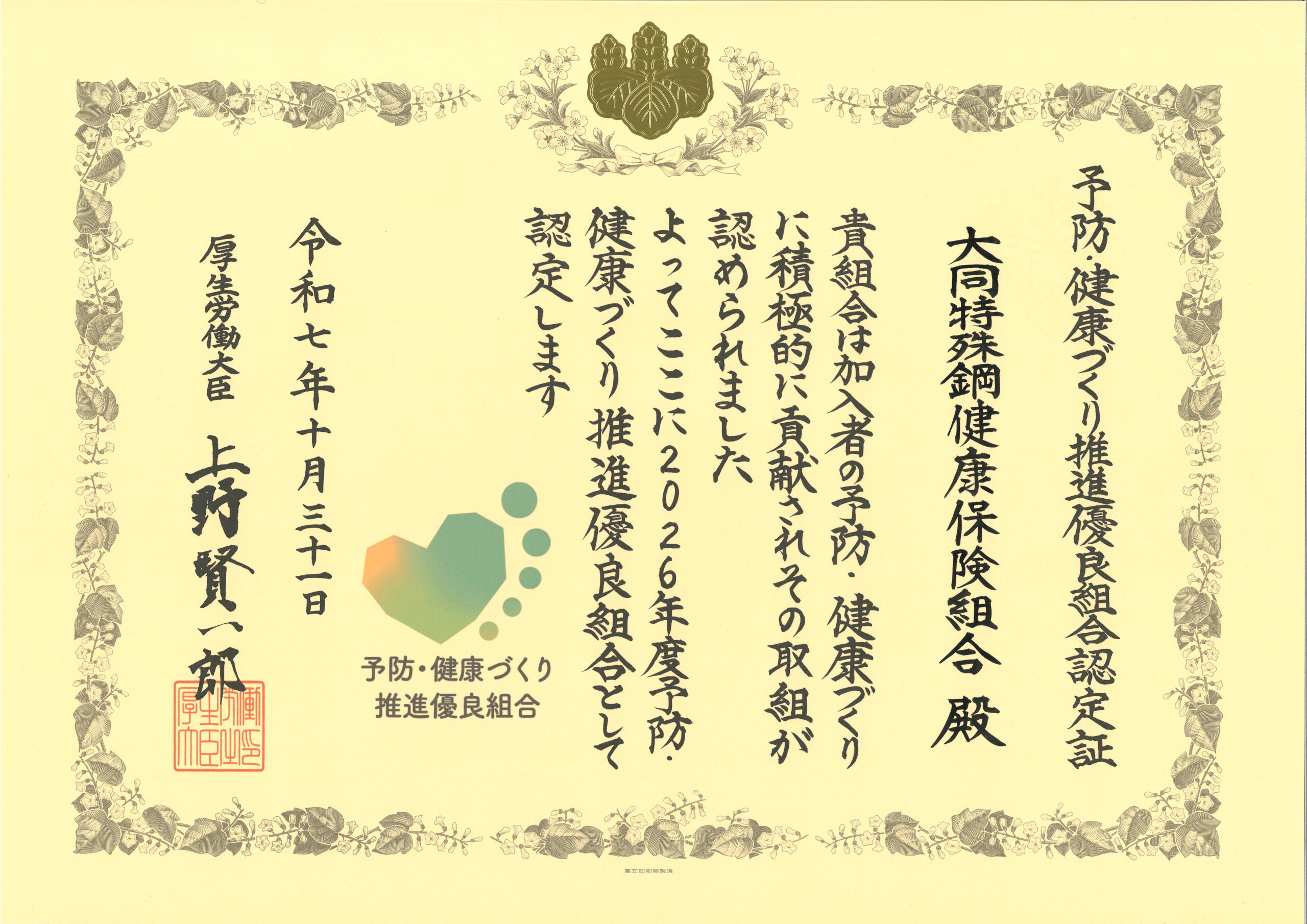 当組合は、厚生労働省が実施する「予防・健康づくり推進優良組合厚生労働大臣認定・表彰制度*」において、同制度の基準を満たし、2026年度の予防・健康づくり推進優良組合として認定されました。